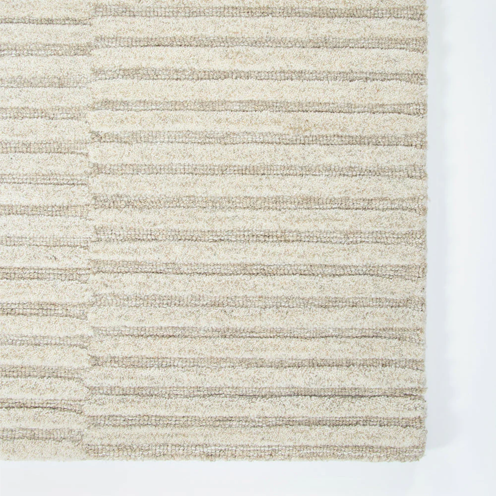 A visual and textural masterpiece, the Anni Wool Rug combines statement design with casual simplicity. Handcrafted from 100% wool, the offset linear pattern is achieved through sections of cut and looped pile, resulting in a captivating textural aesthetic. The natural sand tone effortlessly adds warmth and depth for contemporary living.