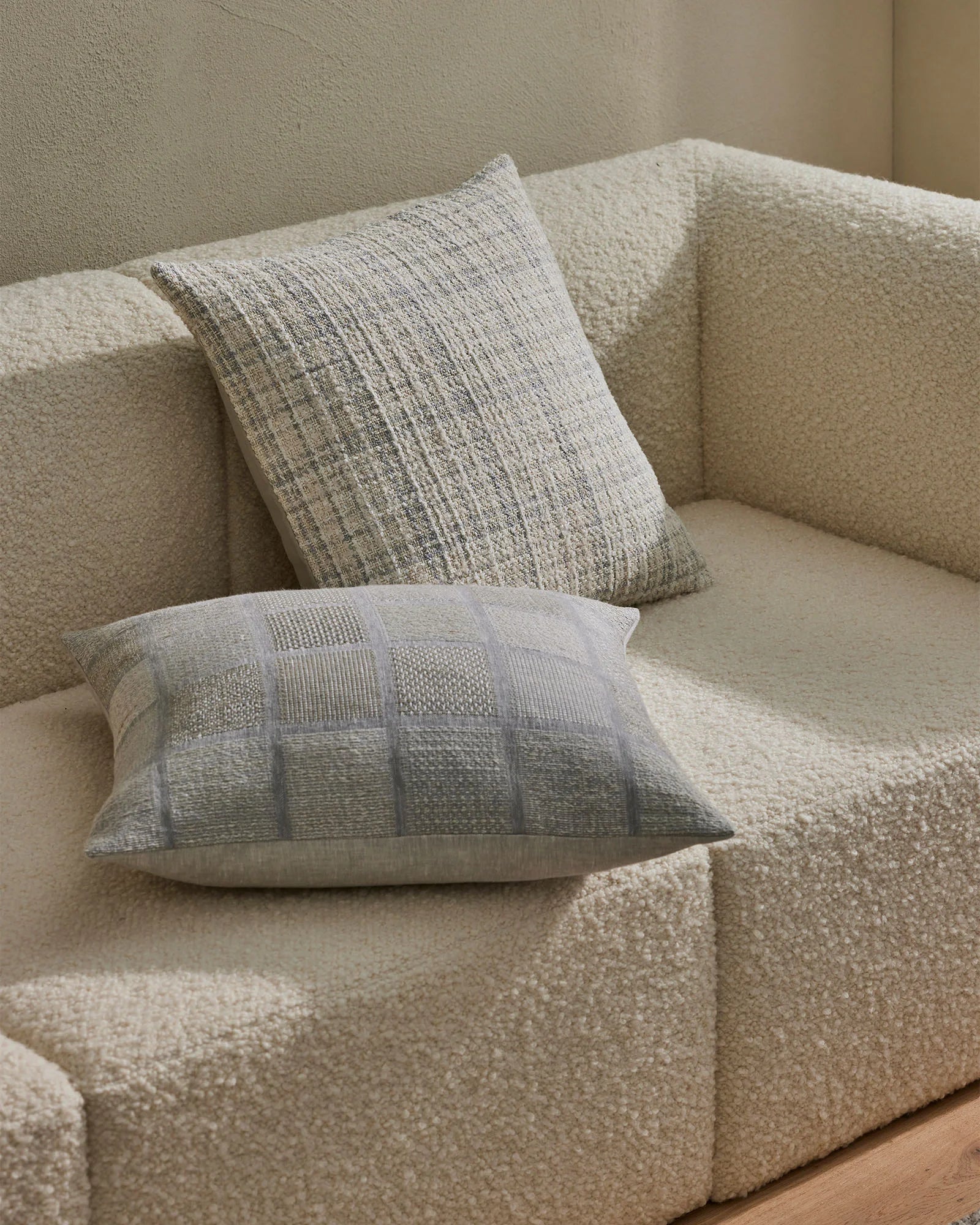 A contemporary, woven linen interpretation of a geometric checkerboard. Featuring panels of varied weave structures and subtle colour variations.
