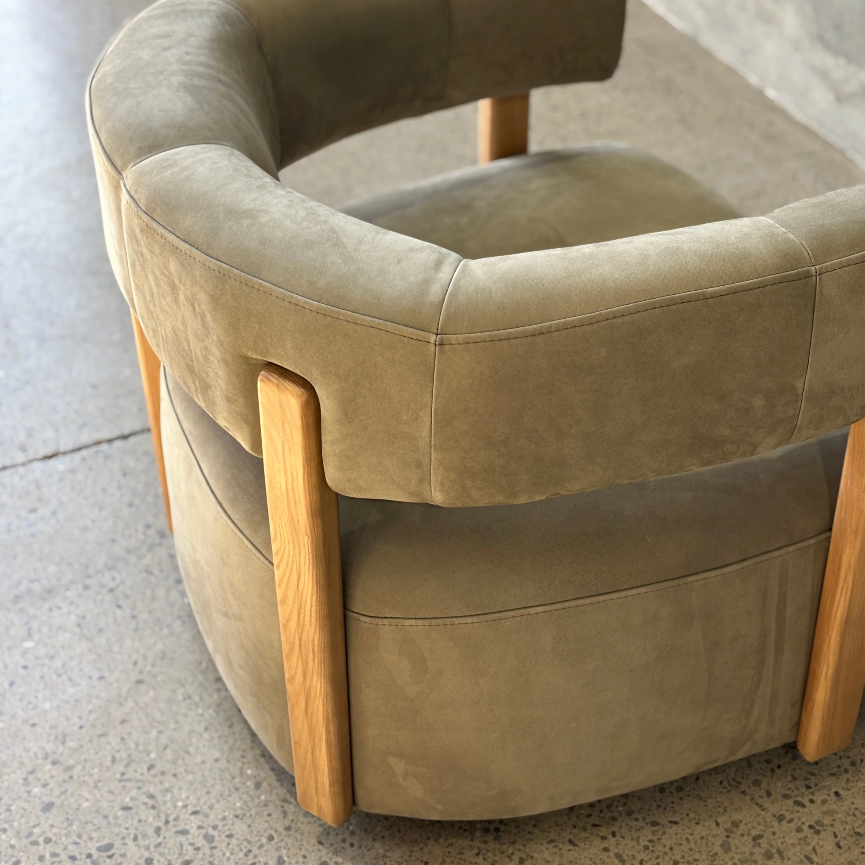 Combining a round form with contemporary details - the Carter Swivel Chair is a perfect armchair option for those wanting something unique yet elegantly refined. Featuring a rounded-square based curved silhouette, cut-out design with timber frame details and upholstered in a gorgeously soft Sage Nubuck Leather. The Carter will add an instant burst of style to any space, with the added flexibility of swivel functionality!