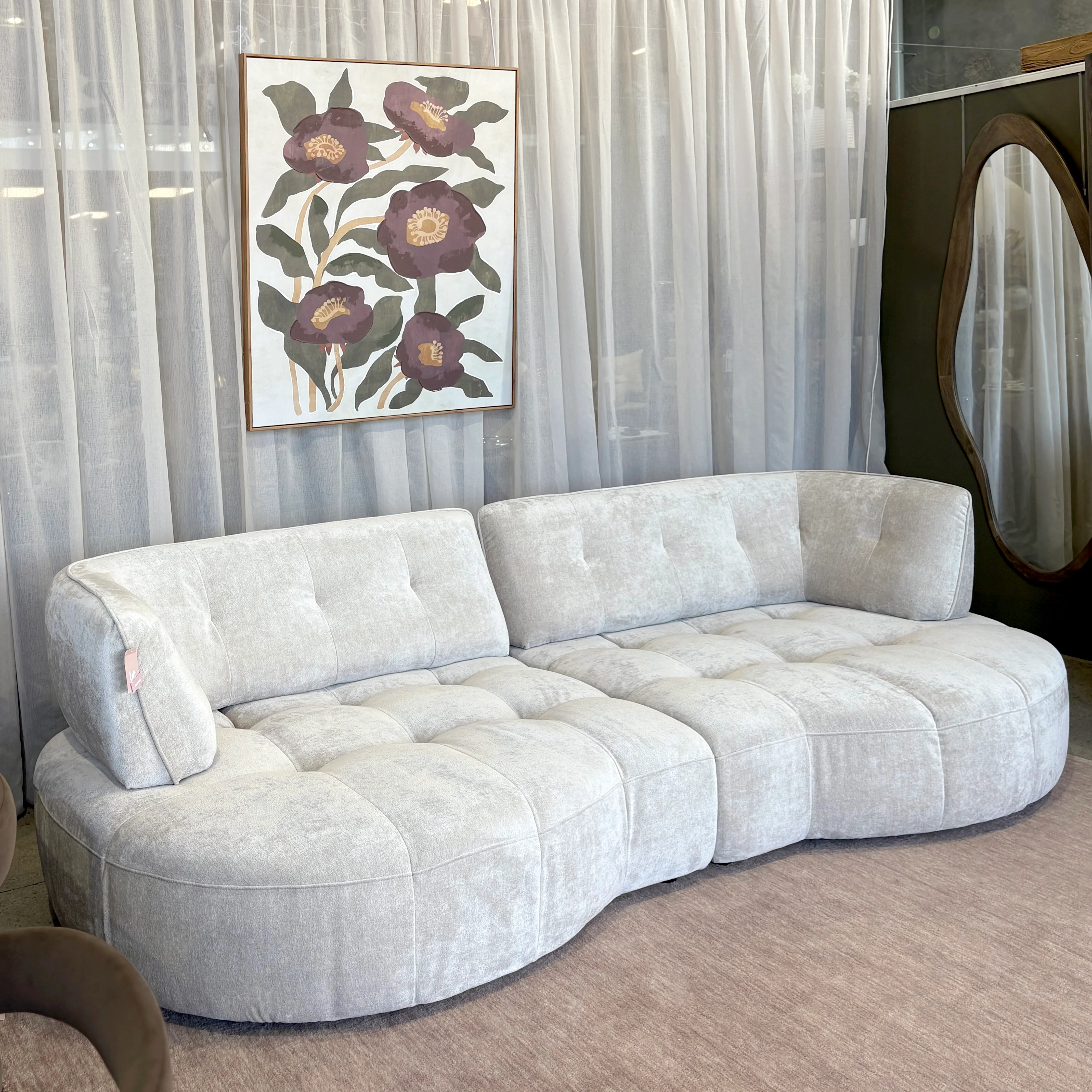 Chic, adaptable and completely distinct: meet the Coco Sofa, our latest unique curved sofa offering. Constructed as two adjoining mirrored pieces at an extra-large 3.5 seater size and featuring an adjustable curved back and arm, giving you two options for seat depth. This levered mechanism allows the back piece to be easily moved forward & backward – allowing you more space to curl up when you need it, just like a chaise!