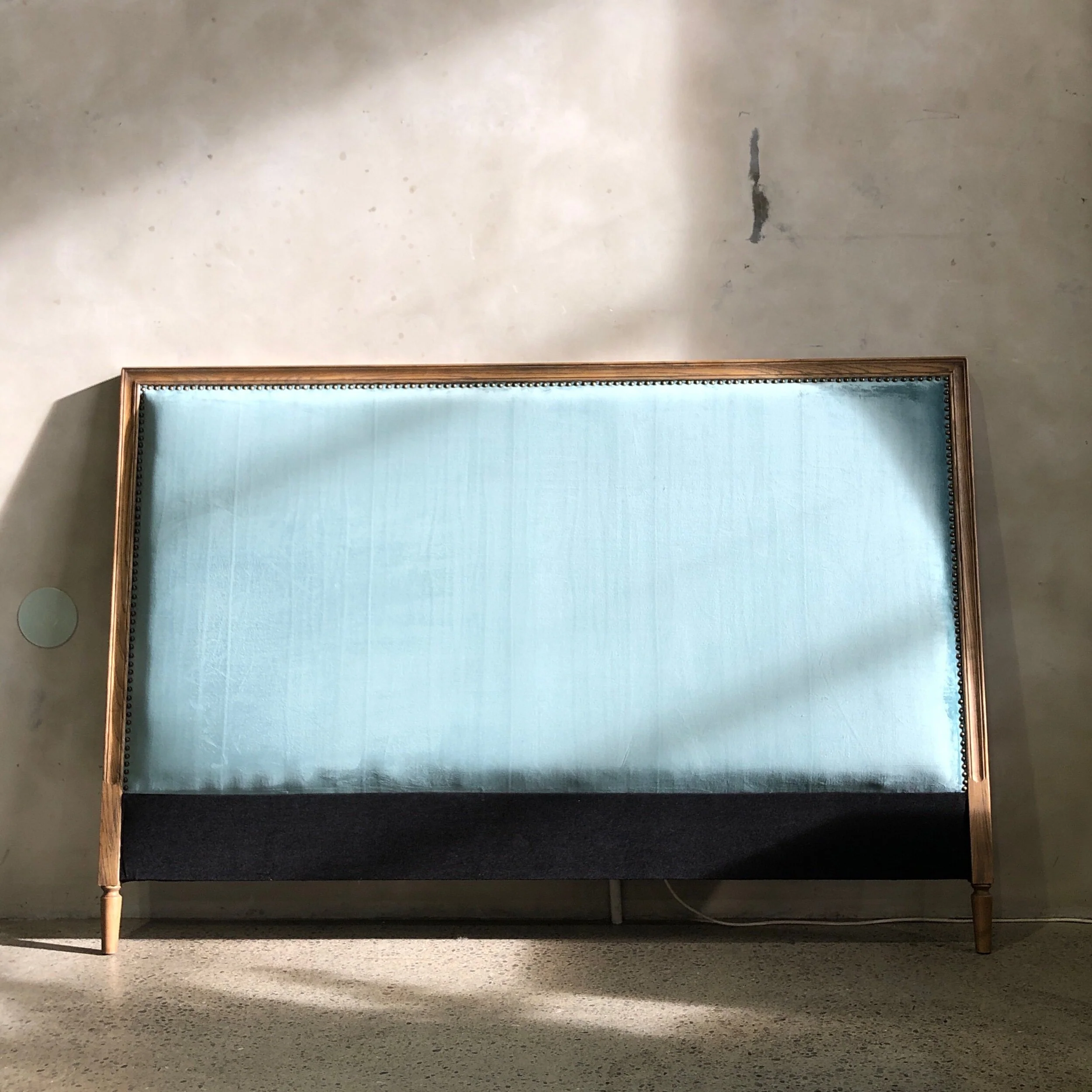 Our ever-popular Frances Framed Headboard has a classic look and timeless quality, featuring a padded upholstered centre framed in solid oak and brass stud detailing. A Loft top seller for many years!