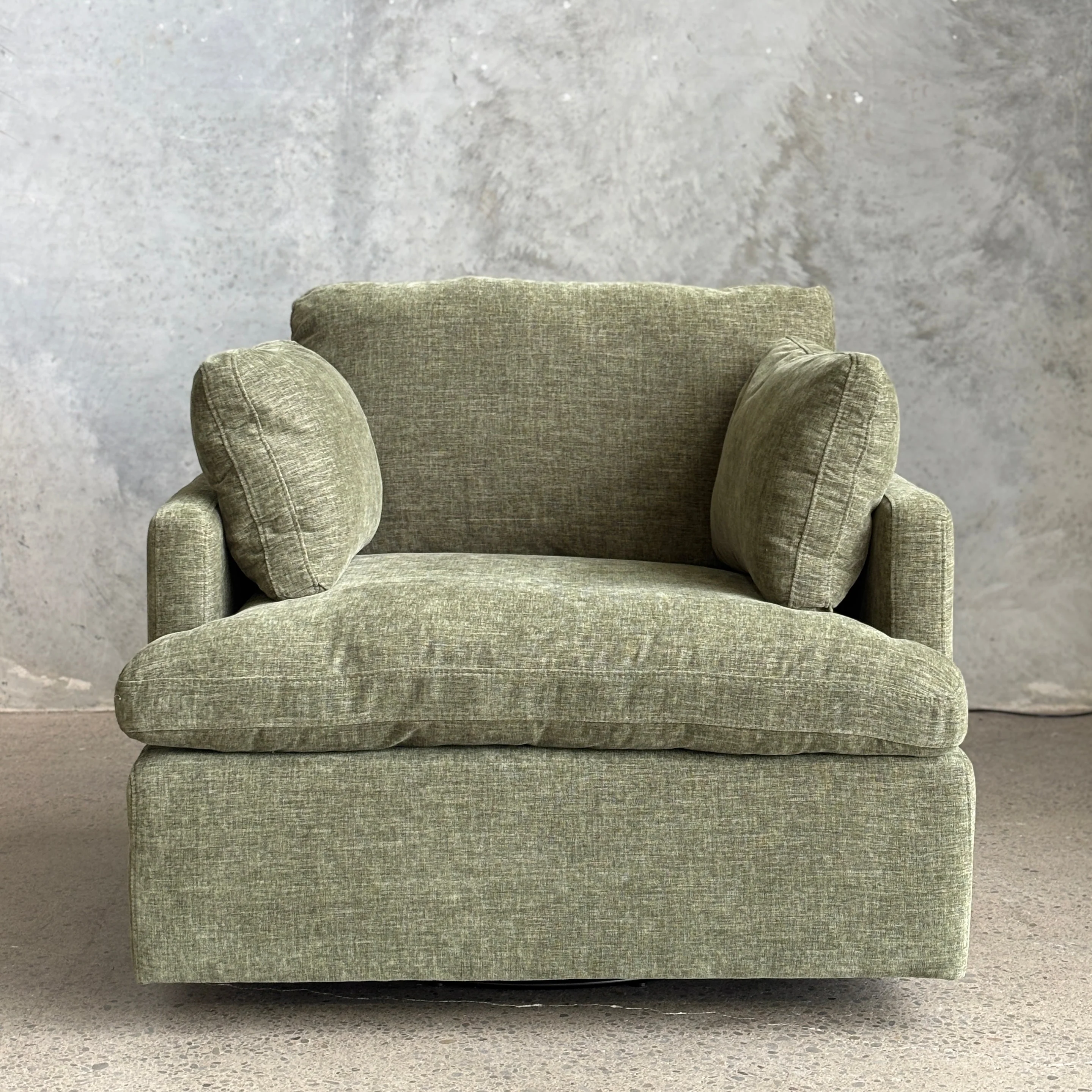 Sink into a luxuriously comfortable moment with our gorgeous Moana Armchair, featuring a king-sized square shape, plush textured velvet fabric and a 360 degree rotating base. This casual but elegant style lends itself perfectly to open plan living areas or anywhere that you’d like a big comfy armchair to sink into! Includes the two arm cushions shown.
